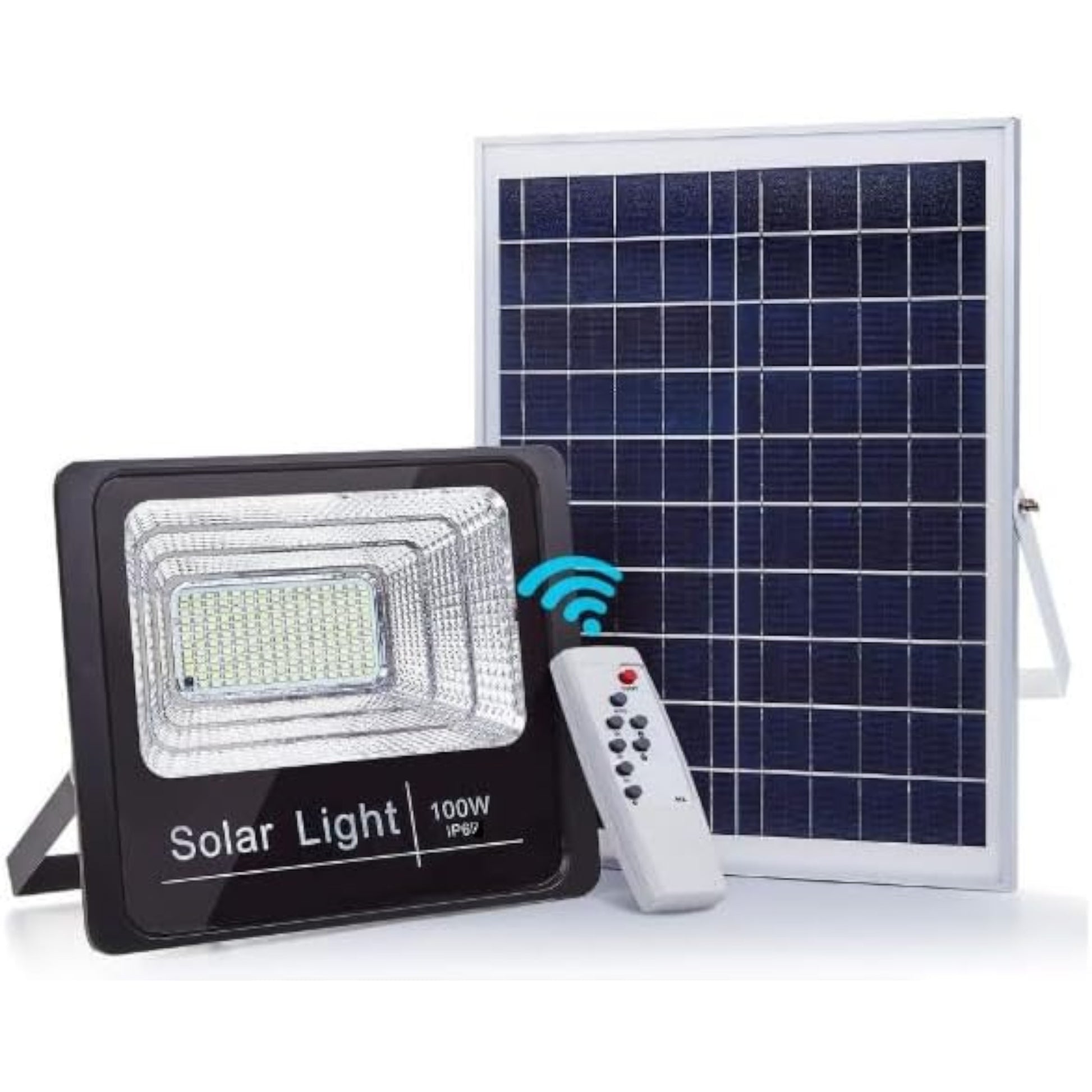 This high-power, super-bright, fully automatic solar floodlight uses only solar energy to provide continuous lighting all night. The solar panel automatically recharges the light during the day with no additional electrical connection needed. High-quality, waterproof design with a built-in lithium battery capable of more than; 2,000 life cycles (5 years). Ideal for Residential Homes, Roadways, Parking Areas, Recreational Parks, Factories, etc. Energy-saving and friendly to the environment. 100W, IP67, 120-degree Beam Angle, and 200 Square Meter Light Coverage Die-cast Aluminium and Tempered Glass, 4.5 meters Waterproof Cable Solar Panel, Remote Control, Wall Bracket, and Accessories Light Sensor (Automatically Switch On When Surrounding is Dark) 10V 20W Polycrystalline, Lithium Iron Battery Approximately 10 - 12 hrs Usage Time and 6 - 8 hrs (Depend On The Sun Light) of Charging.