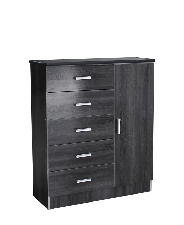 Wooden chest with five drawers and one door. Functional bedroom storage.