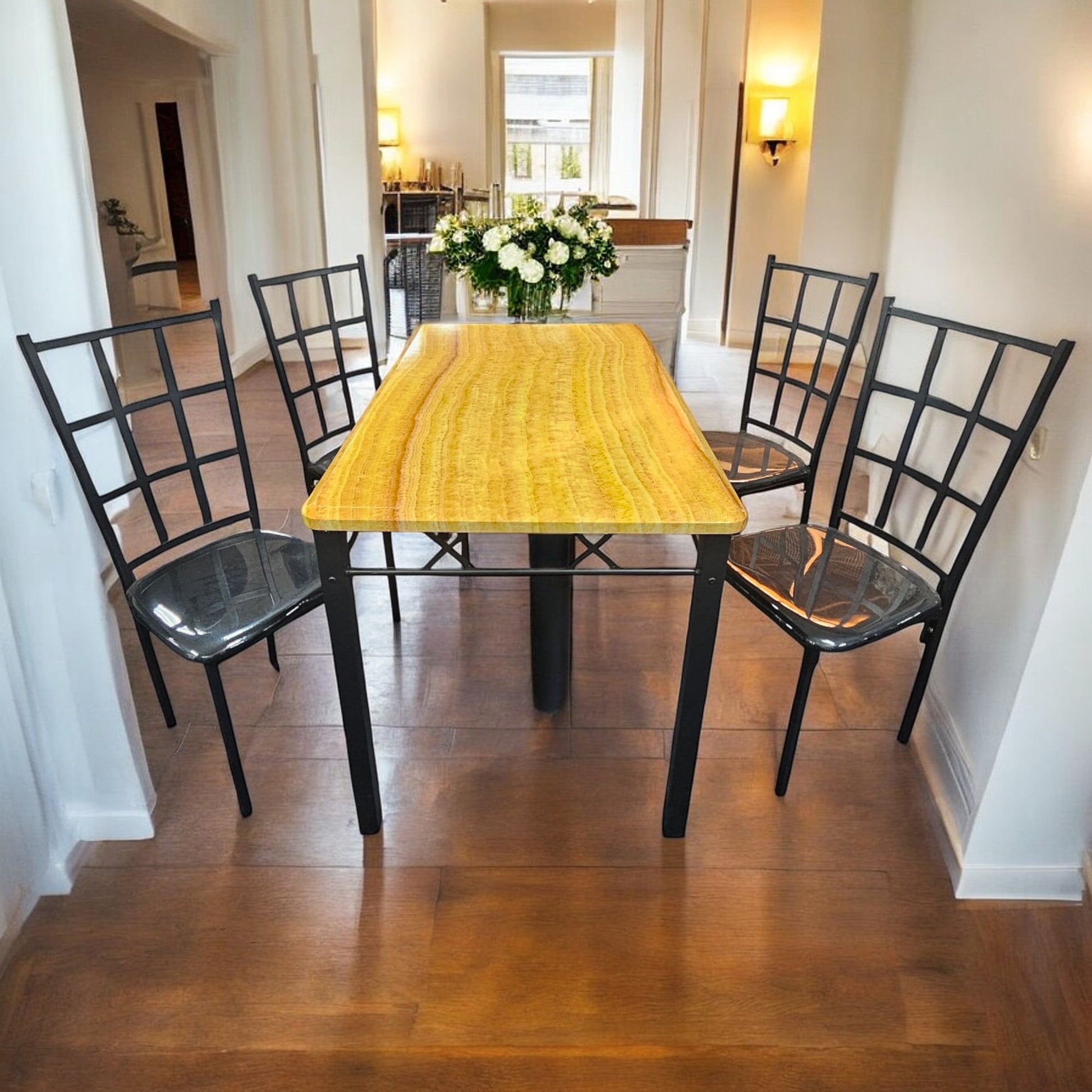 Elevate your dining space with the sleek and stylish MW 550 DRS 4 SEATER dining room set. This contemporary ensemble features a rectangular table with a natural stone top and four matching chairs with a metal grid frame.