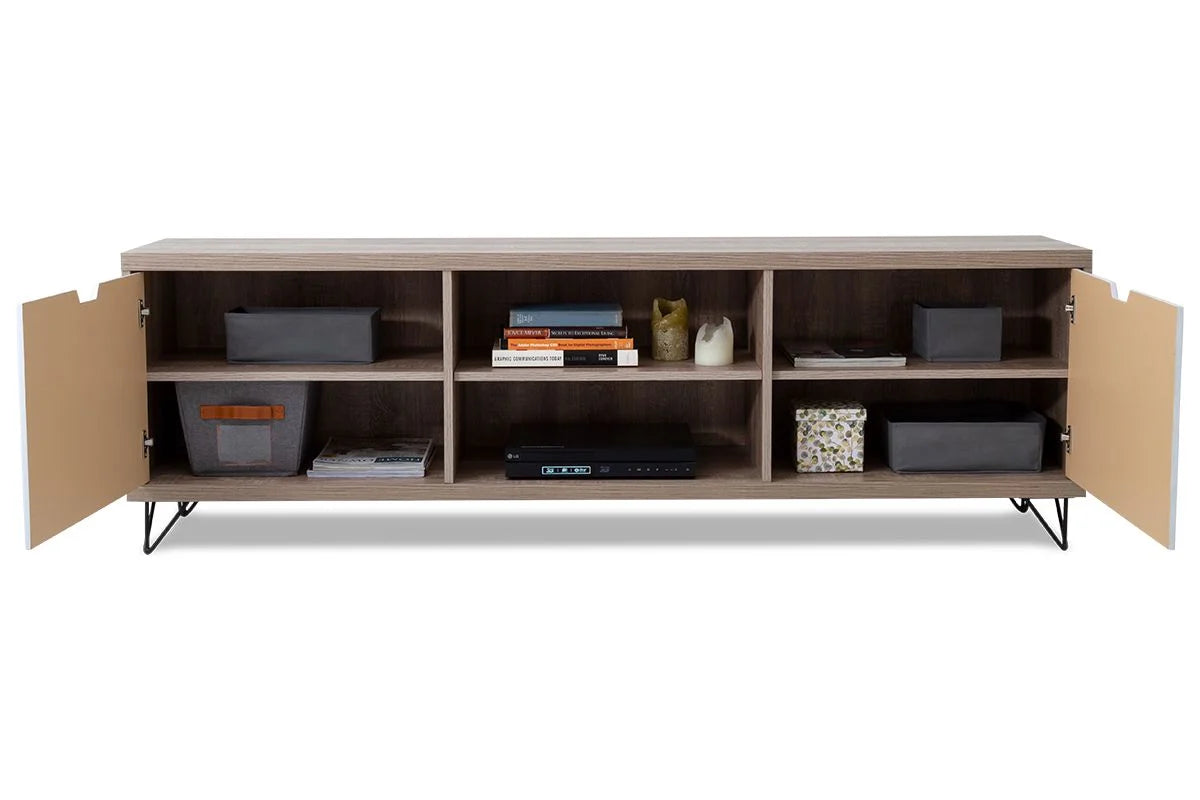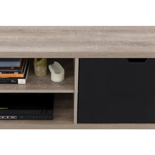 This television unit has an industrial feel to it and represents modern design at its best - from the dark woodgrain finish to the contrasting top, base and sides in light wood to the iron-look legs – it is both funky and functional.