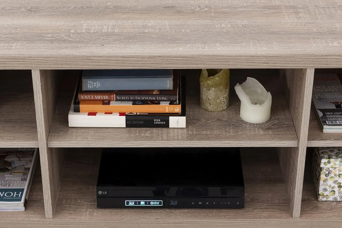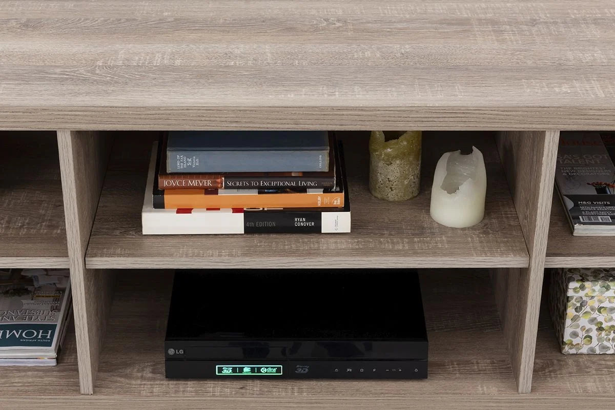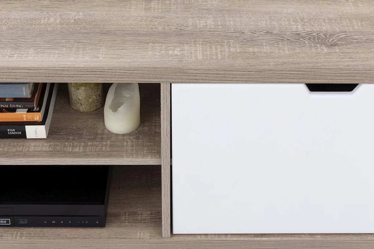 The design is clean and minimalistic with cut-out handles for opening doors. The doors open onto two storage areas with two shelves each. The middle shelves are open and are ideal for electronics or displaying ornaments.